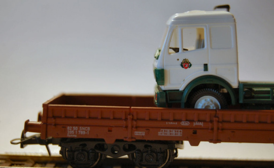 4-Set Niederbordwagen SNCB , je mit einem MB LKW , Fahrerkabine bedruckt mit " Clausthaler " Logo.