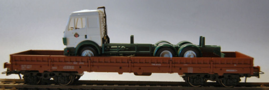 4-Set Niederbordwagen SNCB , je mit einem MB LKW , Fahrerkabine bedruckt mit " Clausthaler " Logo.